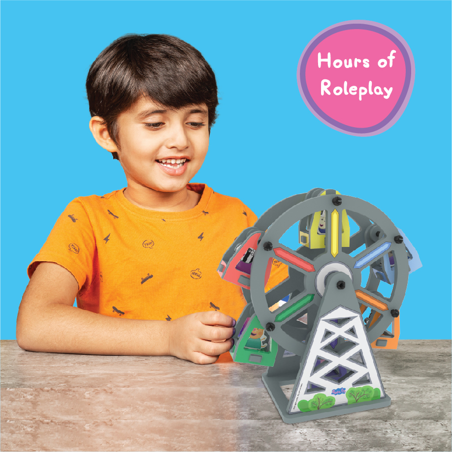 Interactive Fun: The Peppa Pig Ferris Wheel comes complete with moving chairs and a rotating wheel, allowing kids to recreate the excitement of a real Ferris wheel ride. Watch as their imaginations take flight! This aids in the development of cognitive and motor skills.