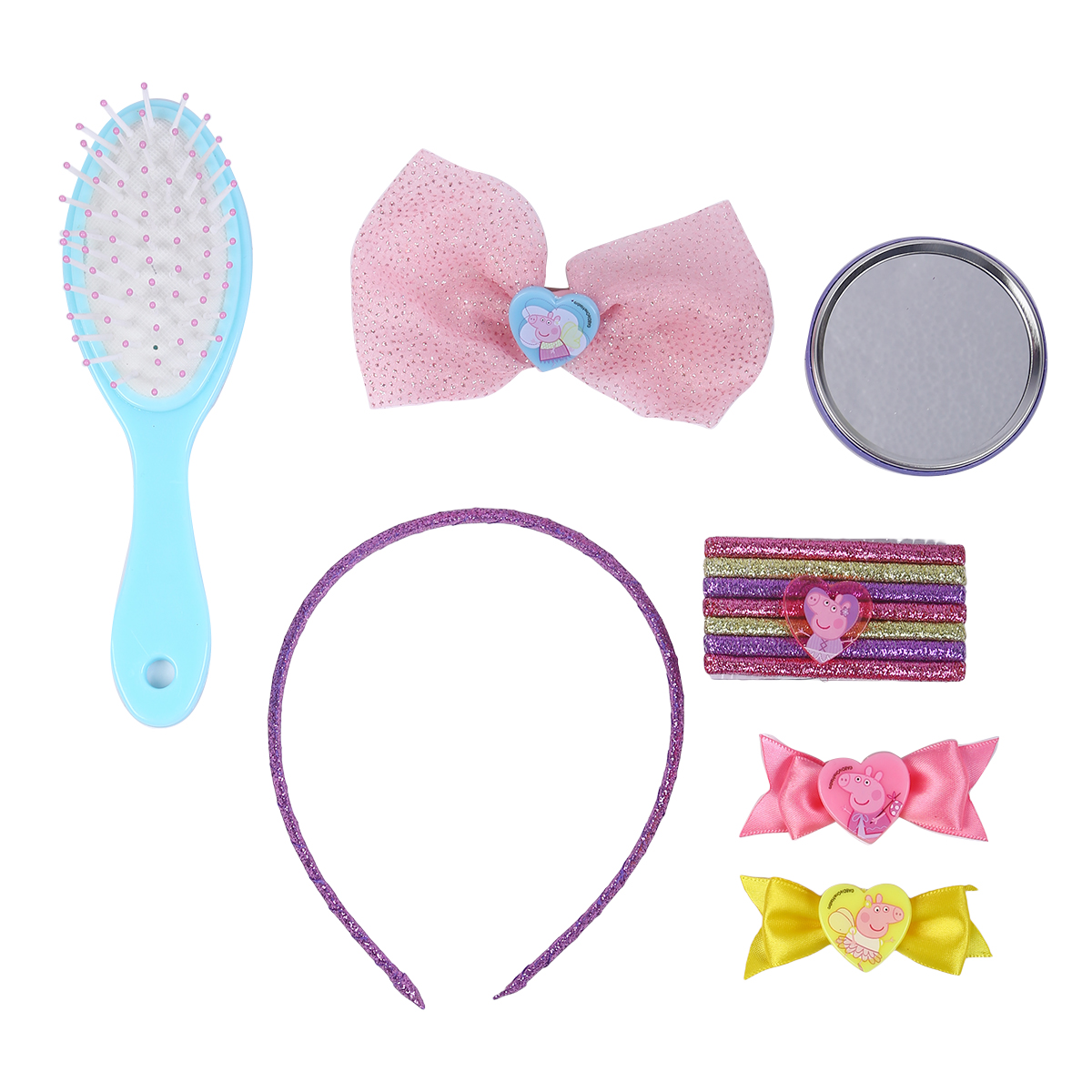 official Peppa Pig licensed hair accessories for little girls. The pack consist of 13 pcs of accessories like a hairbrush, headband with bows, 1 glitter bow made of fabric, 7 rubber bands |